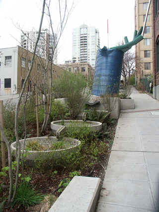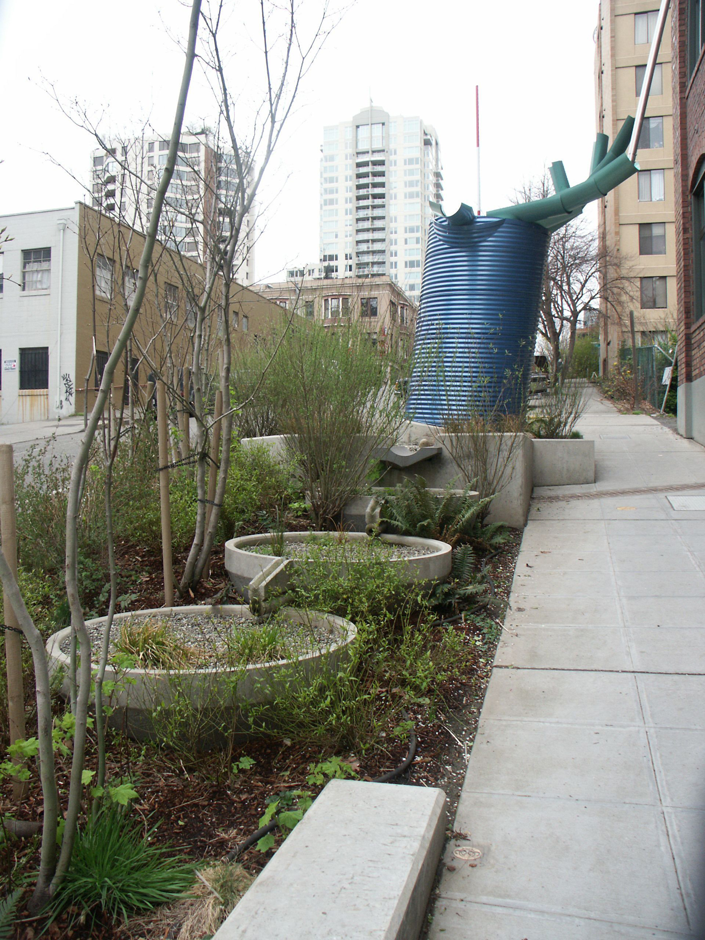 Next door to the sculpture park in Belltown, on Vine Street, the art of infrastructure has been out there for all to see for years. Artist Buster Simpson designed a complex of runnels, downspouts along with a monumental (and whimsical) cistern for capturing and recycling rain water at 81 Vine. The building is owned and renovated by architect Carolyn Geise, who is the chief visionary of a multi-block project called Cistern Steps, which connects this rainwater with the Sound and runs by the Belltown Pea Patch.