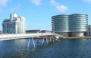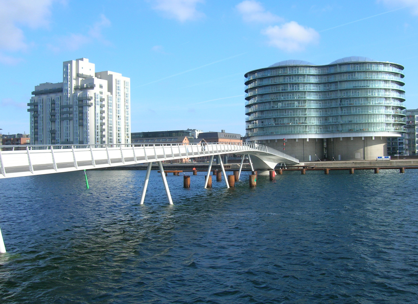One of the most striking features of the new harbor landscape in Copenhagen is a growing network of bridges that pass low over the water. Bridges and shoreline are increasingly full of pedestrians at all hours, according to firsthand observers.