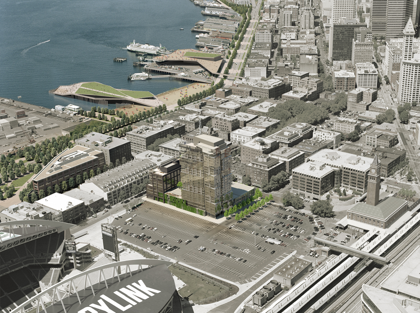 For more than three decades, Pioneer Square has looked south across almost four blocks of surface parking. The North Lot, first by the Kingdome and now next to its replacement, CenturyLink Field, was a civic embarrassment and a developer's dream: a sea of paving in the historic heart of Seattle, large enough to hold a new middle class neighborhood.
