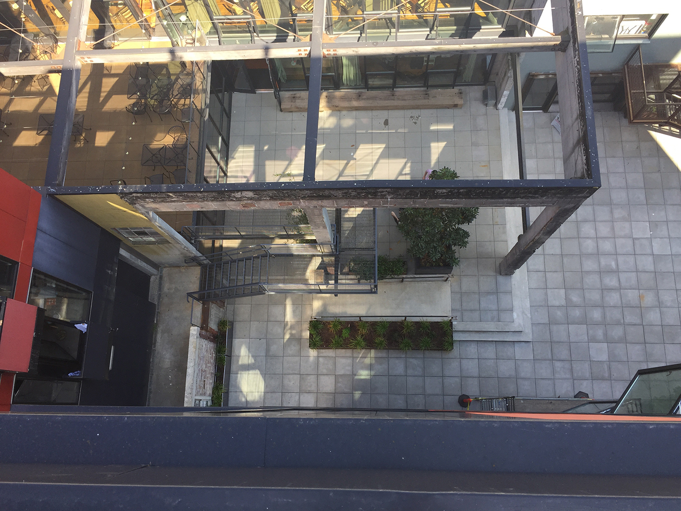 Exposed timber beams from the original auto row building meet rough, board-formed concrete columns and walls with recycled mud brick tiles. Alongside are new steel columns and seismic bracing to bring the old artifacts safely into a new century.
