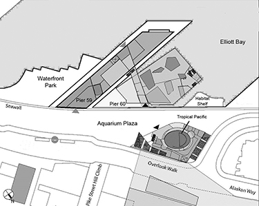Seattle Aquarium fills Pier 59 and Pier 60. While the plan steps eastward, Pier 59 will open westward, toward Elliott Bay, with visual connections to the water and a cafe.