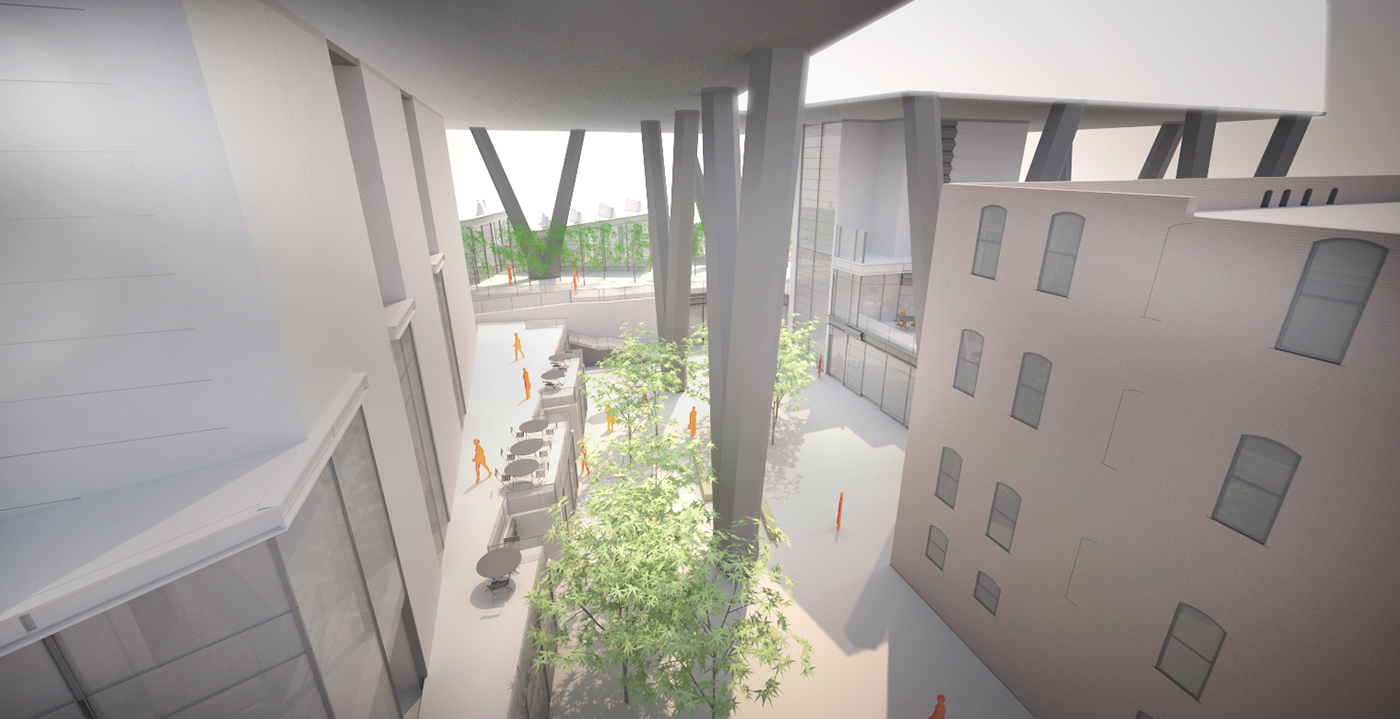 The goal is for the complex to invite pedestrians from many angles and let them choose a path through it, all without leaving the open air or passing through a door.