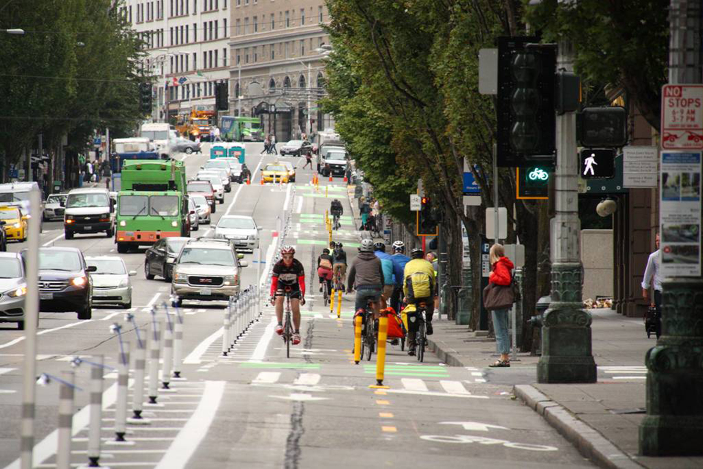 In Seattle, there is a lot of new green paint on Second Avenue. There, the voters ratifying the experiment are bicyclists. They've discovered the new two-way green bicycle-only lane from Pike Street to Yesler. Just to make sure the division is understood, posts separate it from car lanes.