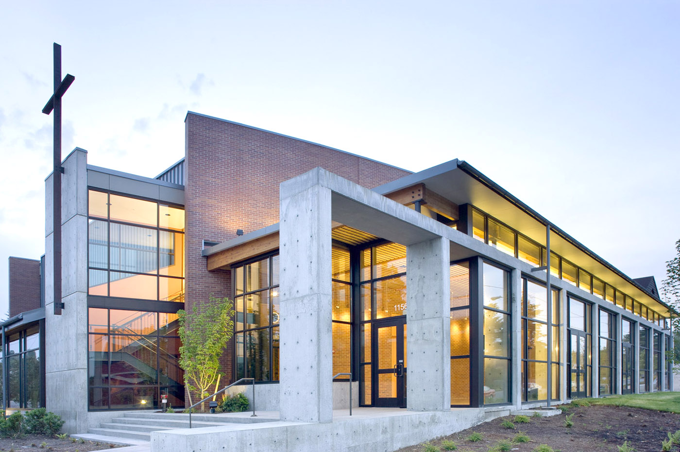 The broad, stepped entrance is located on North 80th Street near the corner. In the middle of the façade, a steel cross floats up from a finely finished concrete wall. On the other side of that, the sanctuary itself opens visually to the arterial, with a long bay of glass panels combined with glu-lam ribs.