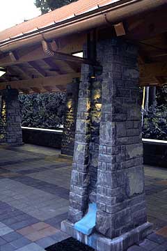 Part of ARC's design includes stone columns with recessed sections where rain water flows from the roof's gutters, creating a water feature that is lit at night. The columns include copper elements that are slowing turning a blue patina.