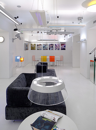The Artemide lighting showroom, at 310 Occidental Ave. S. in Seattle’s Pioneer Square, is a white modernist box in a 107-year-old building that was once a creamery.