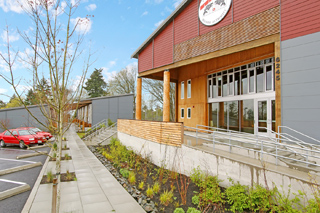 The Puyallup Longhouse (Place of Hidden Waters) in Tacoma was designed to look like a traditional Coast Salish longhouse in a modern townhouse courtyard building.