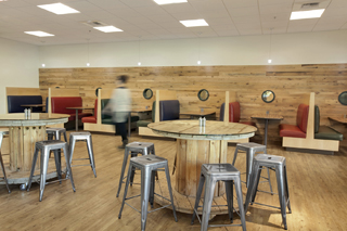 The most recent renovation to the third building has a travel theme, with a coffee bar made to look like a cruise ship. There are lounge areas, a climbing wall, conference center, shower rooms, a theater and fitness center.
