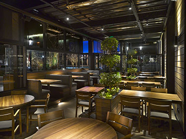Outside is an all-weather dining patio and custom wood and metal elements. The semi-enclosed patio has an operable glazing panel system.