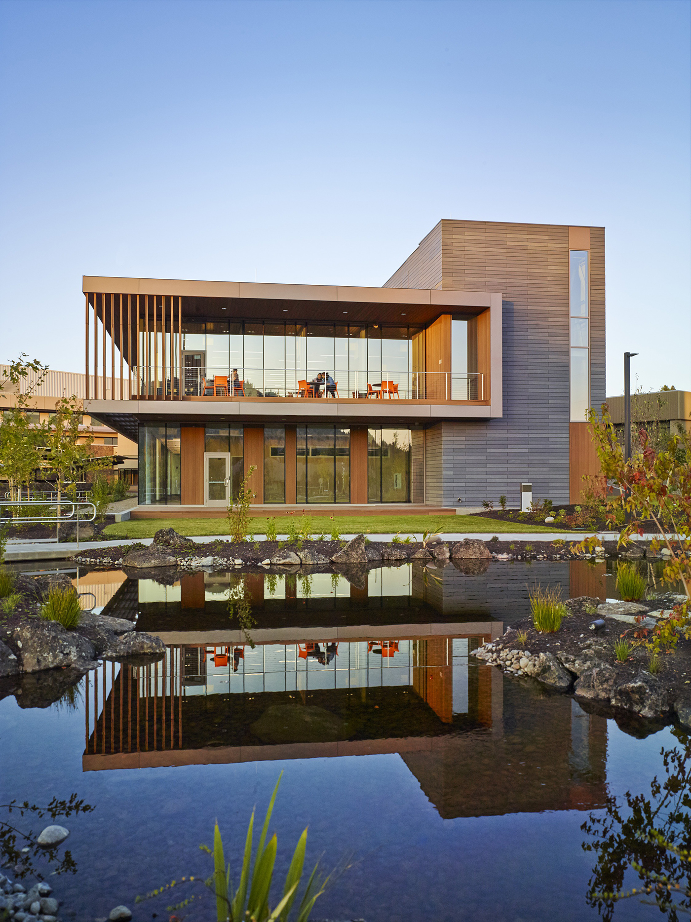 The design uses warm wood tones, a soothing color palette and art that depicts the natural scenery. The exterior is clad in sustainable, wood-like materials that blend with the landscape. There is a healing garden and reflecting pool.