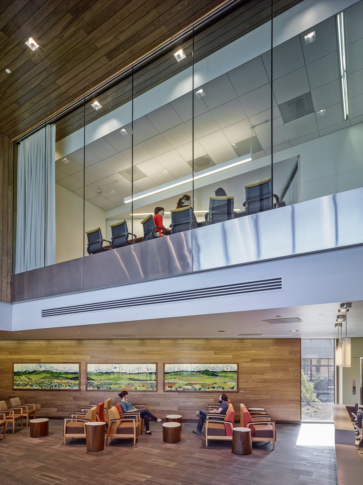 Corridors have floor-to-ceiling windows, and exam rooms have translucent panels to bring in natural light.