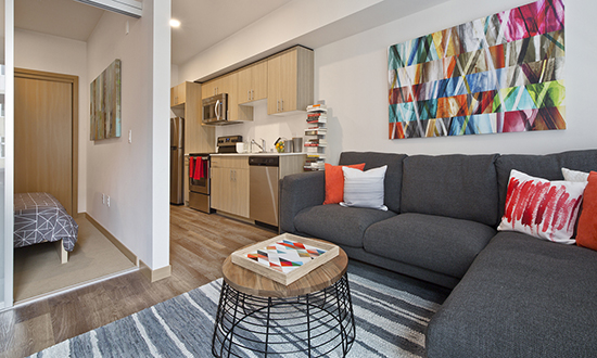 The one- and two-bedroom units surround a central courtyard, and there are two levels of below-grade parking. Tenants share a fitness center, pet grooming area, game lounge and a clubhouse in the courtyard.