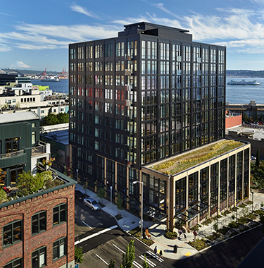 The building has a library, private guest suite for visitors, bicycle workshop and storage, rooftop pet walk and deck with views of Elliott Bay.