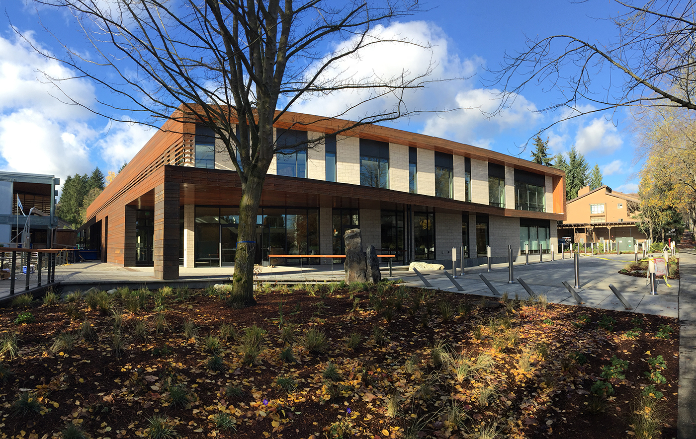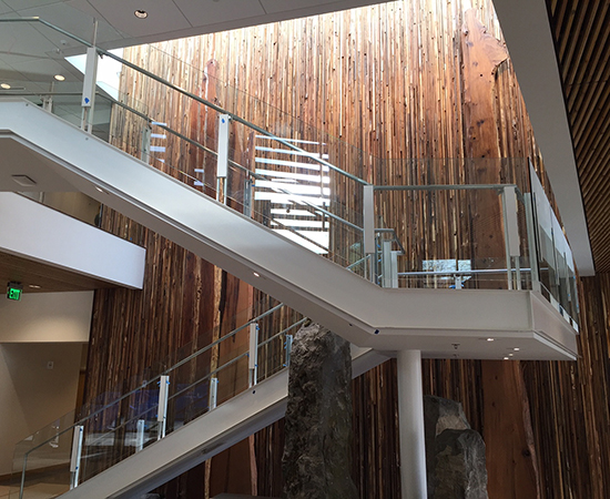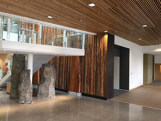 The 45,000-square-foot center was built less than 20 feet from the old clinic, creating challenges for construction, deliveries and staging. Inside, a "Healing Wall" was made from thousands of strips of salvaged wood assembled in the background with slabs of western red cedar in front.