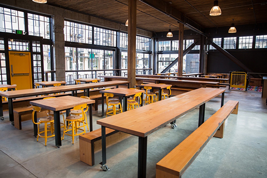 Tables, benches and the bar top were made from wood salvaged from the roof trusses, which were replaced with new steel posts.