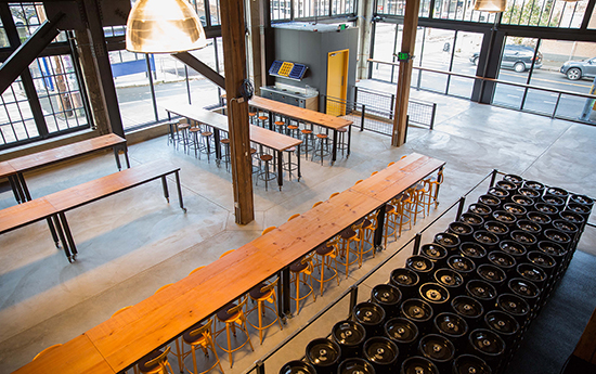 The redesign emphasizes the structure of the single-story building. It has large windows, original board-formed concrete walls, a Douglas fir demising wall, warehouse-style lights and huge stainless steel brewing tanks.