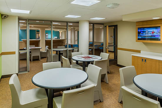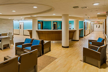 The space is accented with bright colors, and has double- and single-occupancy rooms, nurses’ station and common areas.