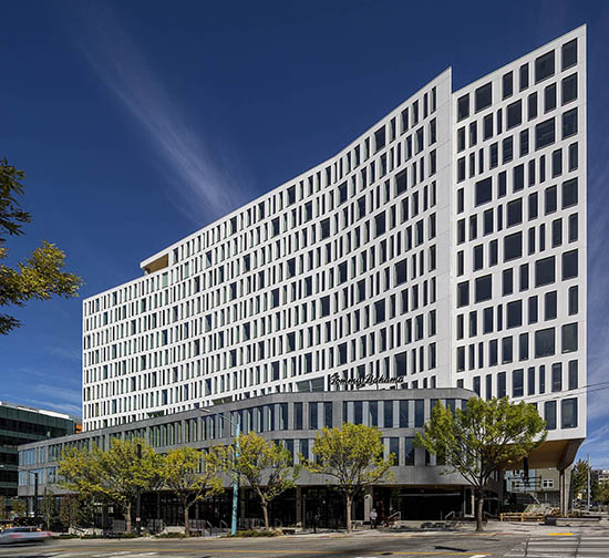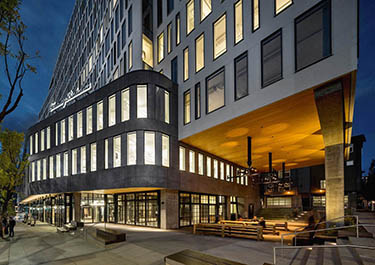 The LEED platinum-targeted project has full-height windows for natural light, as well as a super-efficient European hydronic heating and cooling system. Toilets on the first five levels use rainwater to flush.