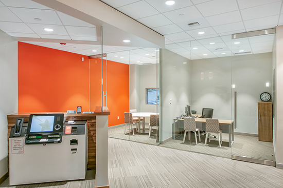 The 10,000-square-foot branch features a daylight filled, double-height space and full-height, frameless glass office fronts.