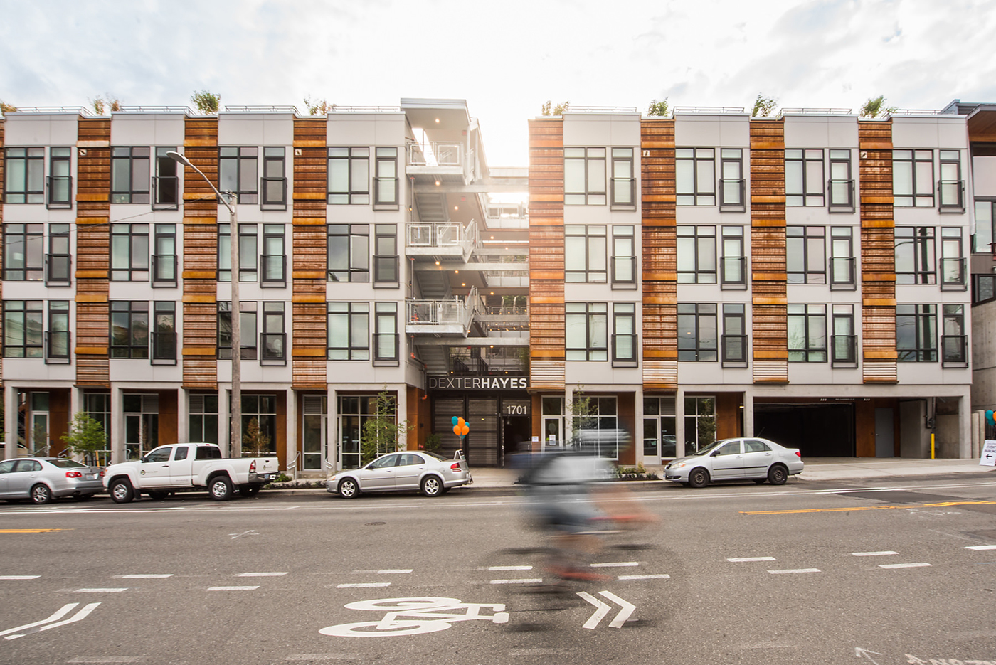 Dexter Hayes is a four-story mixed-use building overlooking Lake Union at 1701 Dexter Ave. N.