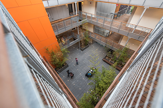 An open stair is at the east-facing entrance and there is a central courtyard within. The rooftop deck has a barbecue and fire pit. Garage parking is available for 44 vehicles; there is also a large bike storage room.
