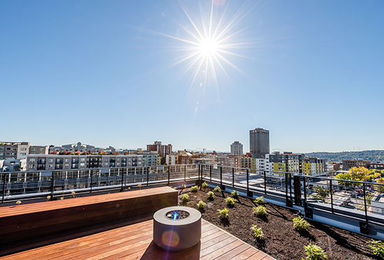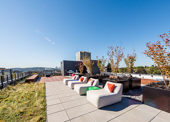 There is a rooftop deck with gathering room, pet-friendly features, and spaces for students to study.
