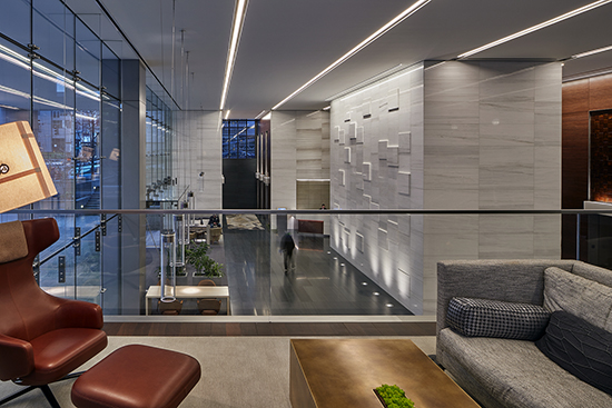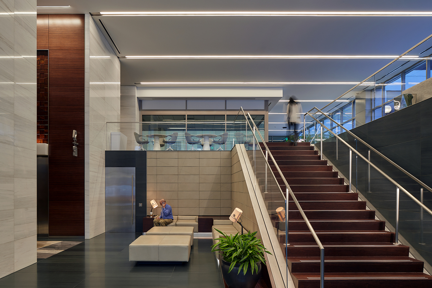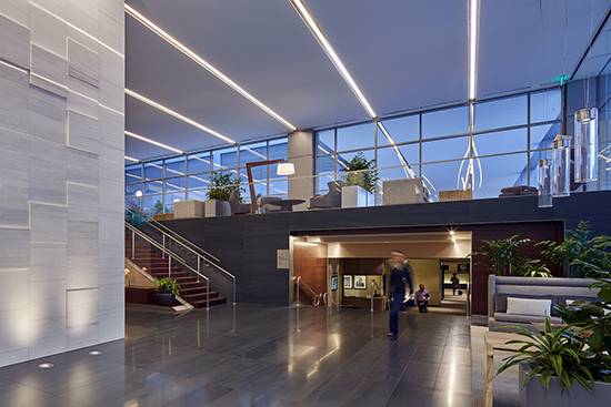 The $46 million project resulted in new finishes and a brighter space. Work involved relocating 24-foot curtain walls to expand usable interior space. Upgrades were made to bathrooms and elevator cars. The structural pinned glazing system was brought from England. Finishes include marble and stone, stainless steel curtain-wall supports and accent pieces throughout.