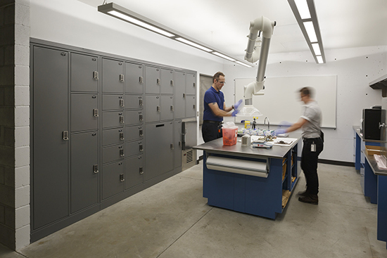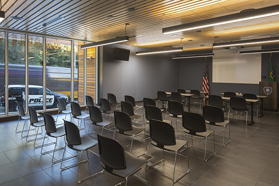 The 29,000-square-foot space houses offices, dispatch operations, a community meeting/training room, locker rooms, holding rooms, K-9 and bike patrol, and storage space on two upper levels and a basement.