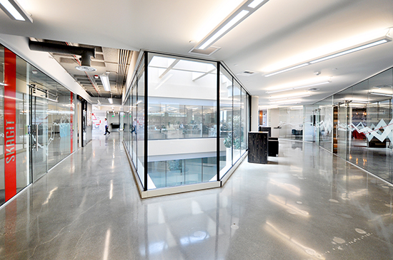The space has skylights, floor-to-ceiling windows and four atriums. The center atrium houses the primary kitchen and lounge.