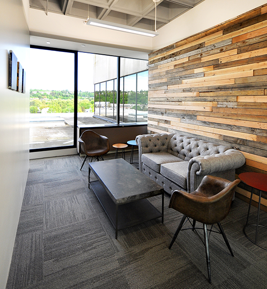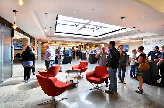 Many elements were built and designed by Andersen employees, including sliding steel doors, wood tables and a concrete bar top.