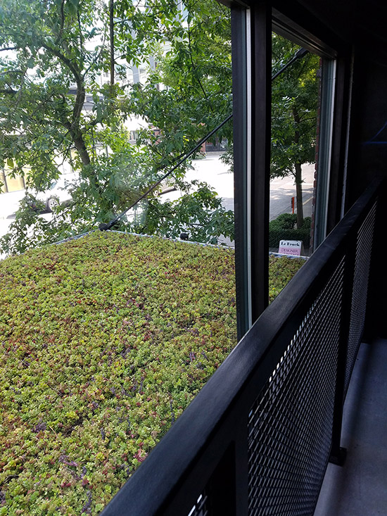 Residents share a 3,000-square-foot green roof, with seating and vegetation. Awnings at the retail level use plants to filter stormwater.