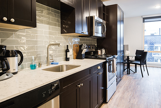 Units have large turn-and-tilt windows, that are triple-paned to reduce noise and energy costs. Efficient toilets, low-flow showerheads, low-flow faucets, and high-efficiency appliances help reduce indoor water use by 45 percent.