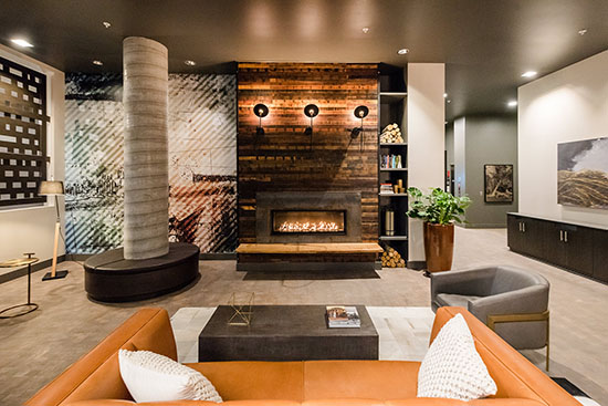 The complex has a skylounge, with a large kitchen and bar, banquette-style seating, and an indoor/outdoor fireplace. There are two rooftop decks and a pet area, and a media area for private events. Residents can also access secured, illuminated bike storage rooms on each residential level.