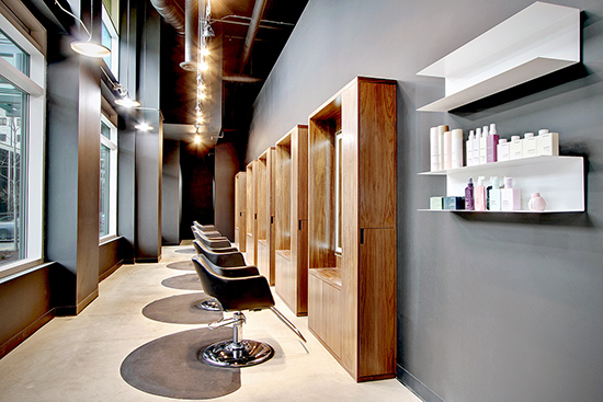The tenant improvement project started with an empty shell and limited square footage. The owners called on a design-build firm to build out the space, including styling and shampoo stations, private esthetician rooms, and restrooms connected through a central core to help guide people through the space.