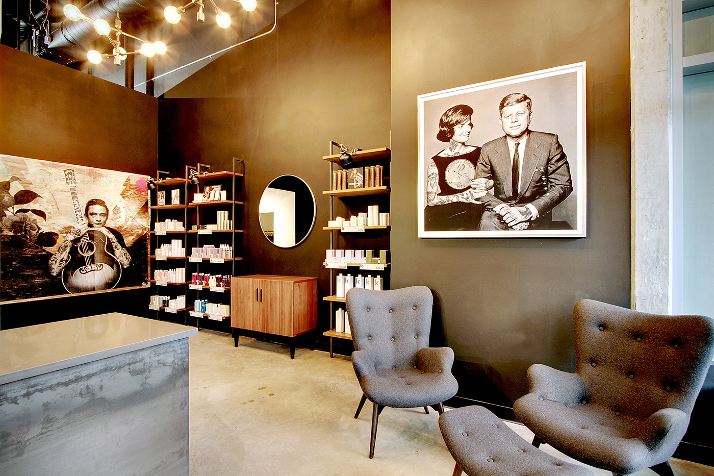 The design uses a minimalist palette of concrete, walnut and steel, creating a clean canvas for original art pieces, including a portrait of the salon's namesakes by local artist Cheyenne Randall.