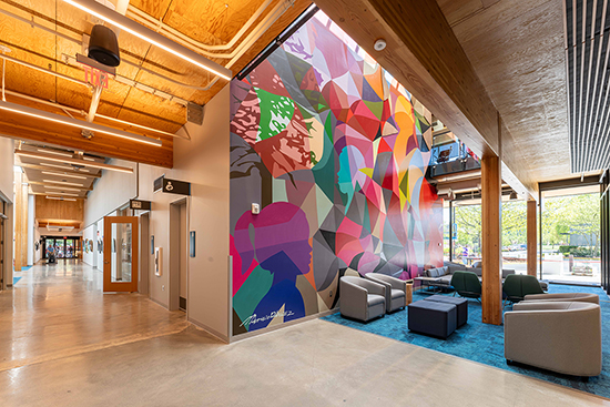 Public art celebrates Redmond’s culture, history and diversity, including a multi-story mural visible in the entryway.