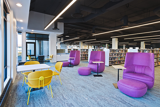 A highlight of the library is the children’s area which was transformed from a space narrowly focused on reading into one that encourages multi-sensory learning. It has kid-sized book shelves and seating, plus an interactive peg board wall installation that combines digital and analog elements.