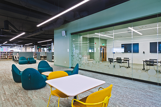 A flexible community room, used for meetings, events and gatherings, was added as part of the upgrade. It was created via a glass Nanowall that can be folded away to open the room to the rest of the library.