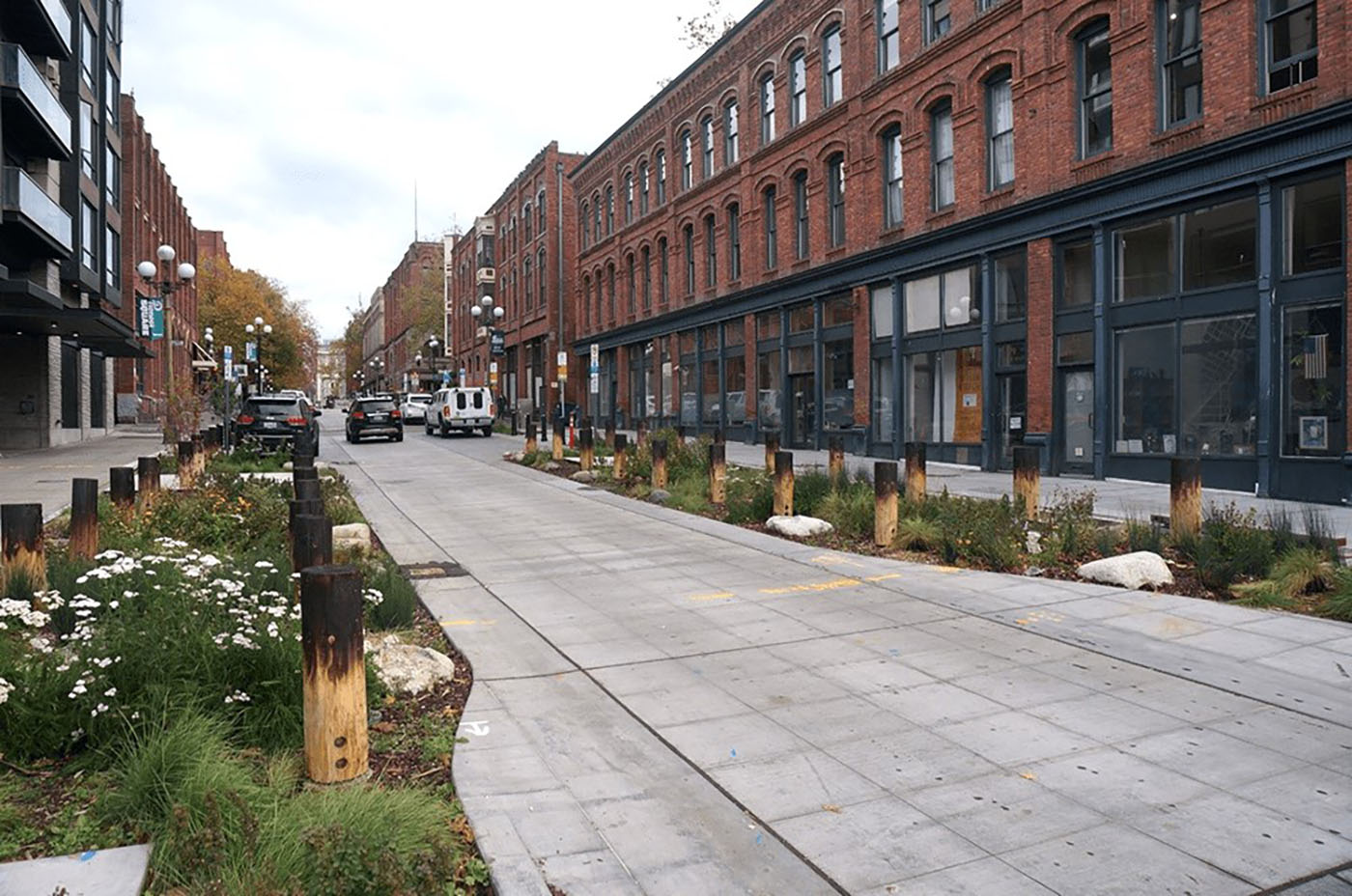 The work included nine new raised pedestrian crossings, four new blocks of curbless streets, and 13,400 square feet of new planted areas.