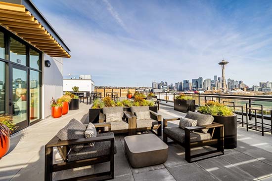 The 167-unit building includes an amenity center with a resident lounge and 24-hour fitness studio, and retail space on the ground floor. A rooftop deck has views of the Seattle skyline as well as a fire pit and grill stations.