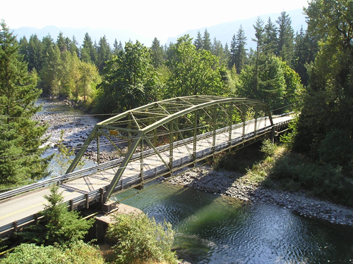 The Mount Si Bridge, built in 1914, is King County’s oldest Pratt truss bridge. The pin-connected structure is in poor condition, with thick rust and peeling lead-based paint.