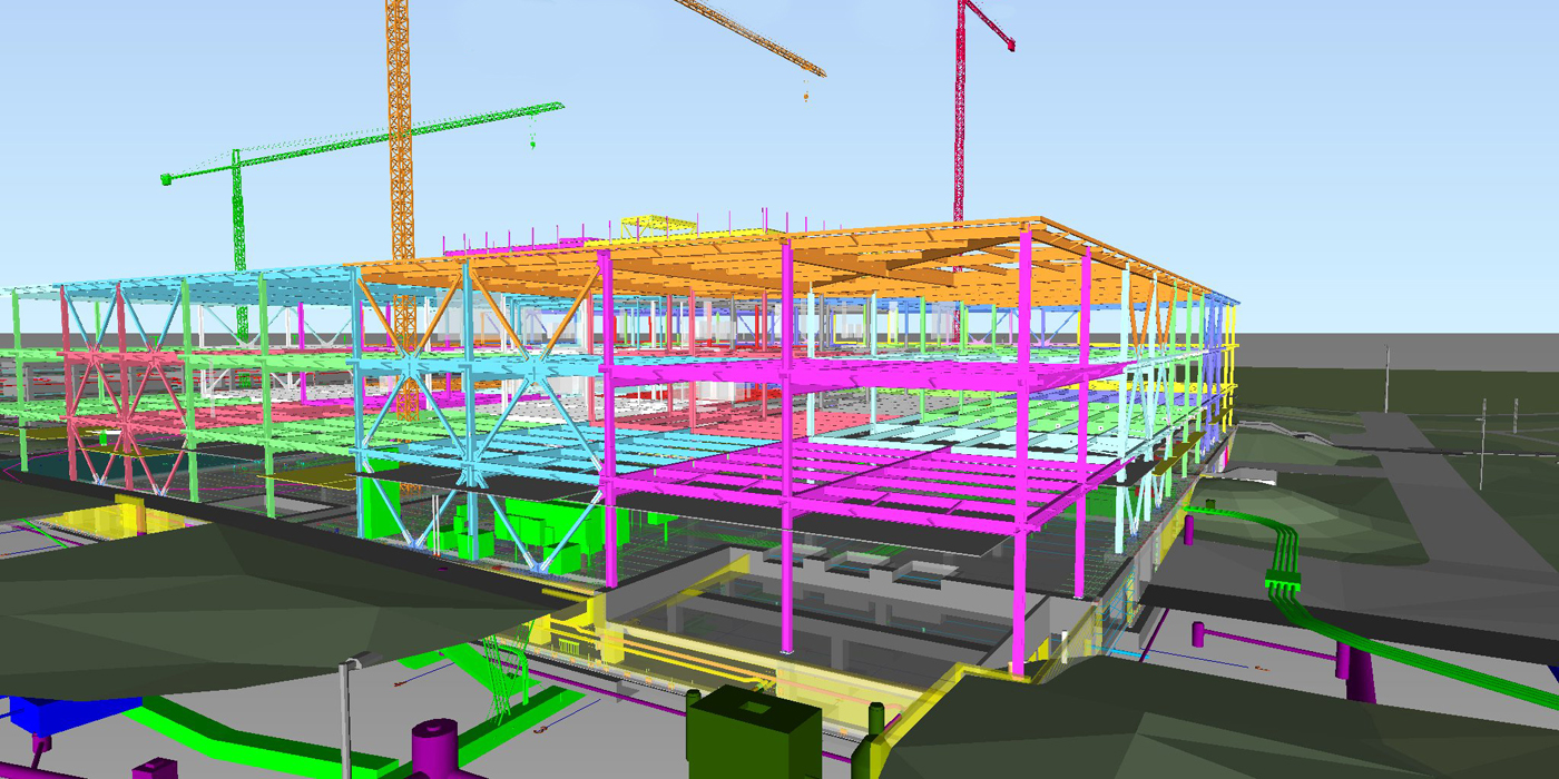 This consolidated model snapshot shows site utilities, structure, crane erection phasing and more. Colors note which steel delivery should be erected by which crane, helping save time and reduce errors.