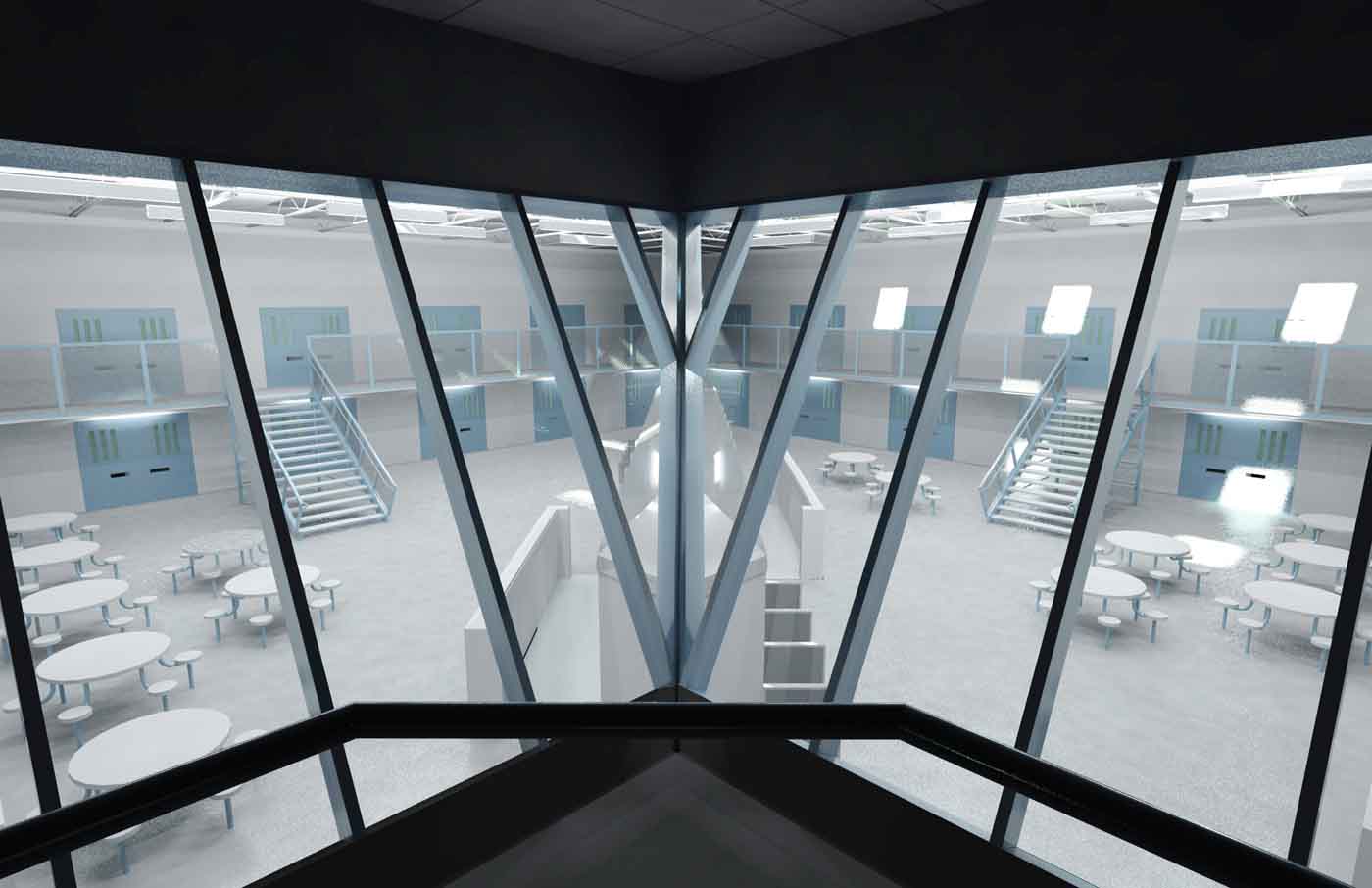 He expects this configuration also will help reduce the jail's operational costs. A podium with a control room rises in the middle of each of the two general housing units, providing a 360-degree view for guards, who can remotely operate doors and locks. This allows the jail to rely on supervision by fewer guards, though some additional corrections officers will be needed to do bed checks at night. “This still results in much less staff during the slow periods,” Buursma says.