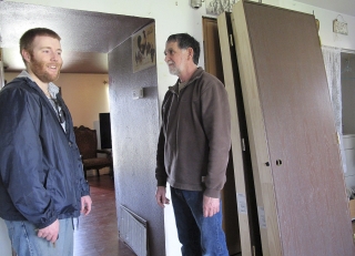 Workers Fred Johnston, left, and Tom Nelson talked last month during a Habitat for Humanity home rehabilitation project in Spokane.