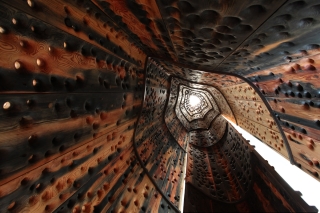 The system he devised for the sculpture involved nine sets of steel collars that bolt together, each adding another vertical tier ranging from about 3.5 to 9 feet long. Carefully cut wood planks — about 200 in all — each slide snugly into the collars, obscuring them from view. Steel ribs run between the top and bottom of the collars and nestle vertically between the planks to help hold them in place. Small gaps between the planks allow room for the wood to expand and contract.