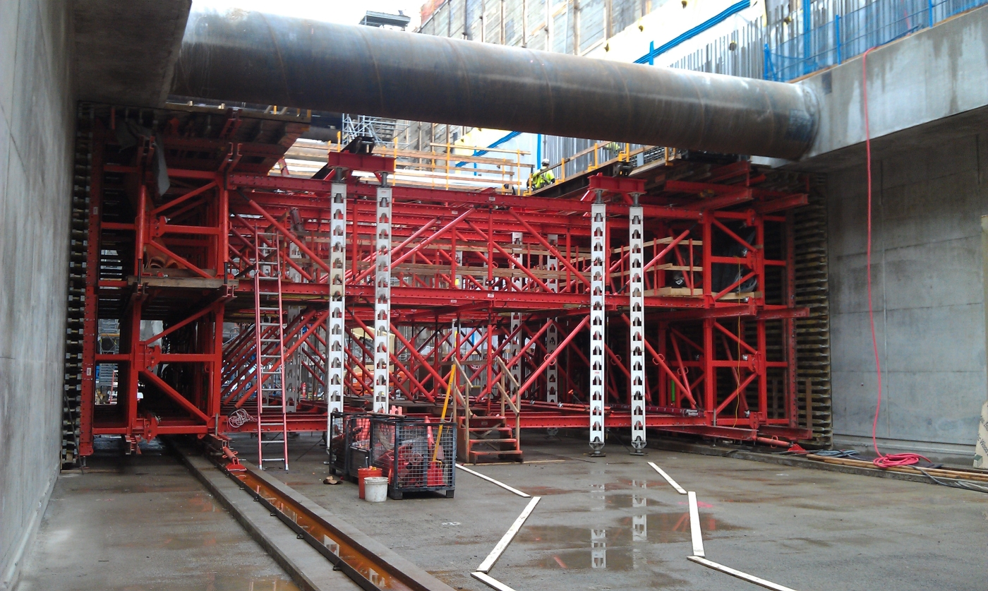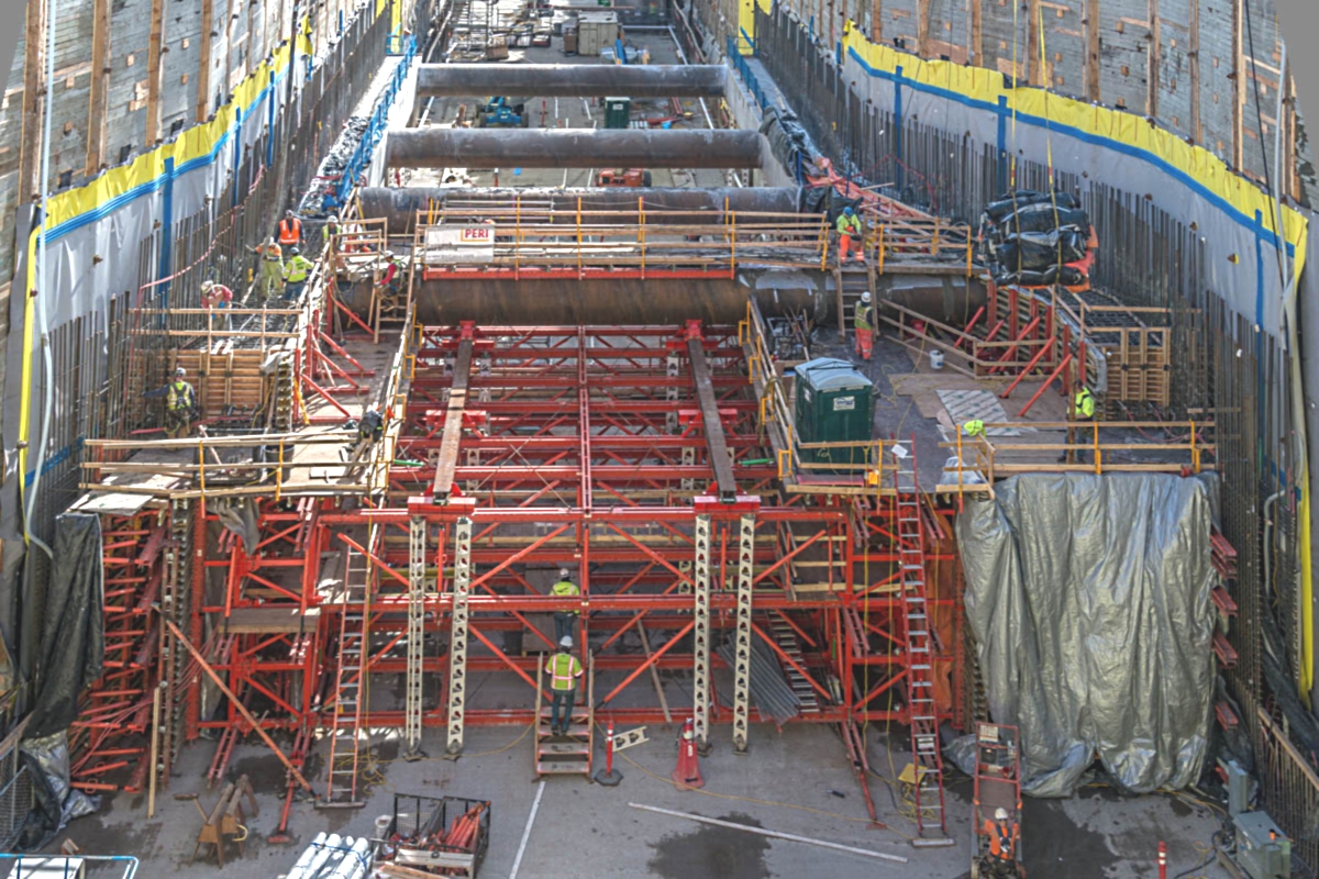 Grose said Turner is using Peri's Variokit, an engineered construction kit that allows both sides of the station to be poured simultaneously. Hydraulics are used to raise and lower the system.