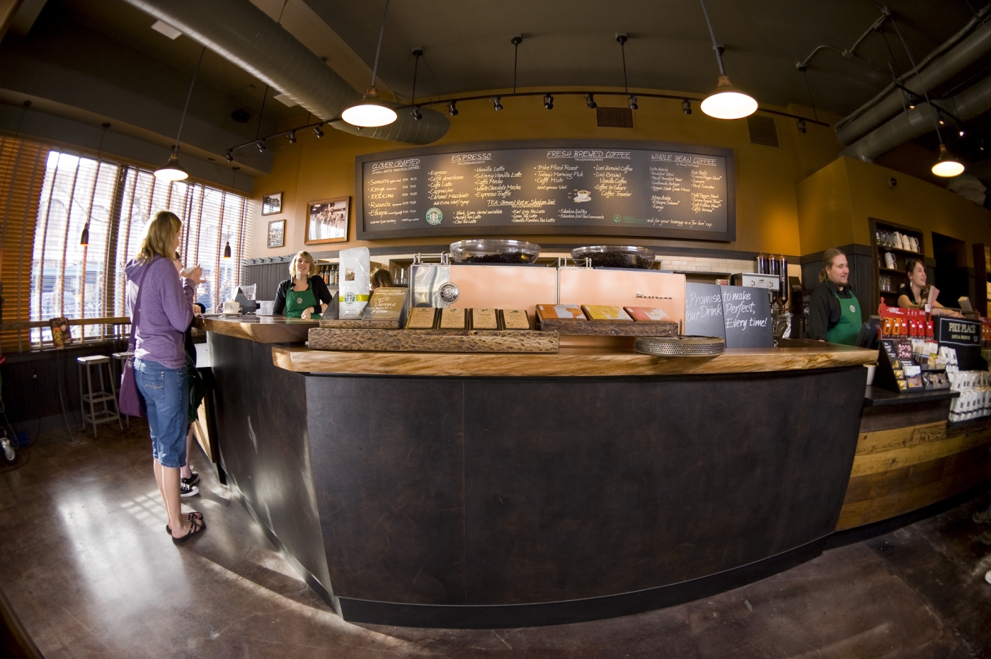 This Starbucks store across from Pike Place Market used a recycled leather product for the front of the barista bar.