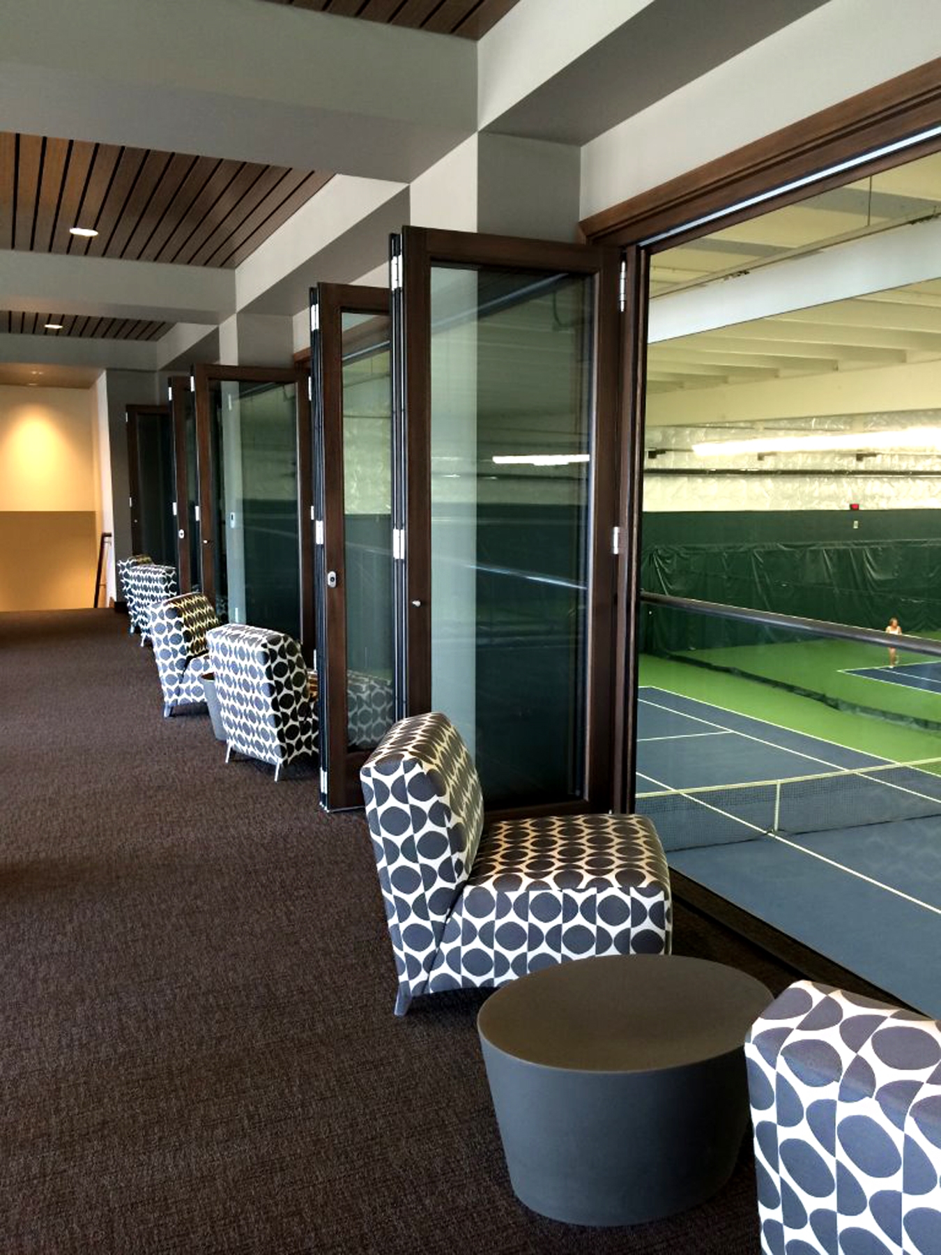 The two-story, 4,900-square-foot pro shop is adjacent to the indoor-court building. It's more than twice the size of the single-story pro shop it replaced. The new building also houses a lobby, coffee bar, viewing areas for the indoor courts, offices, restrooms, and a spacious rooftop terrace that overlooks eight of the 13 outdoor courts.