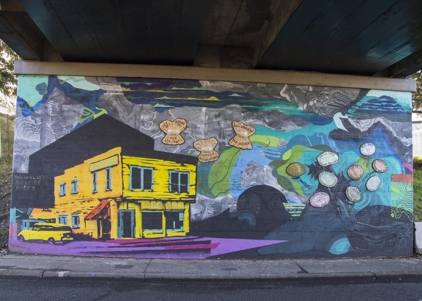 Artists Claudia Riedener, Christopher Paul Jordan and Kenji Stoll created this mural under a railroad trestle in South Tacoma.