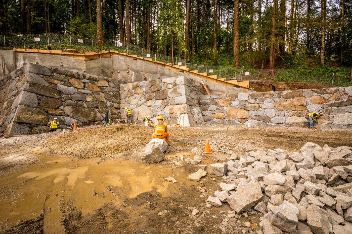 The project, a retaining wall called the Castle Wall at the Portland Japanese Garden, involved 1,000 tons of Eastern Oregon granite to build the 185-foot-long, 20-foot-tall wall. The first of its kind in North America, the wall required 3,400 labor hours to cut, chisel and stack the granite.